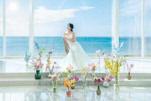 「ザ・ヨミタンリゾート アクアグレイス」は、沖縄県読谷村に位置し、海まで徒歩10秒というロケーションを誇るリゾートチャペルです。目の前に海が広がる開放的な空間では、挙式はもちろん、フォトウェディングやパーティまで、多彩なスタイルを自由に組み合わせることが可能です。
