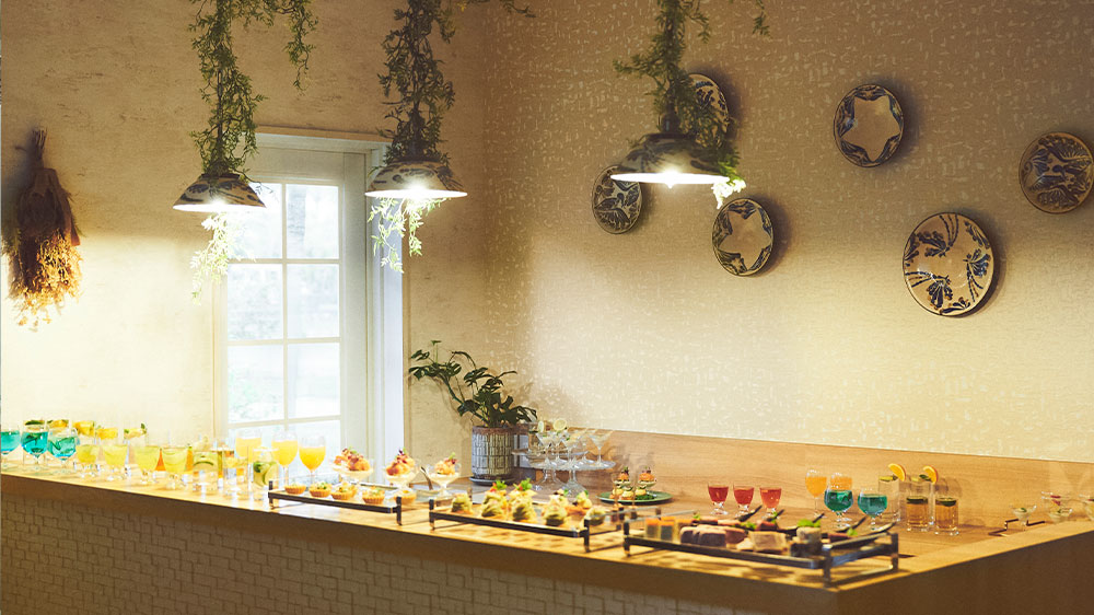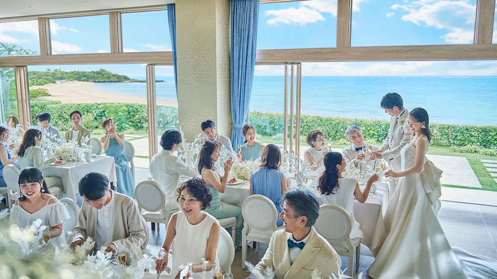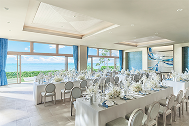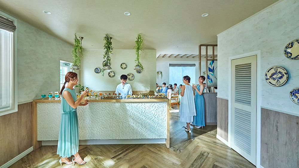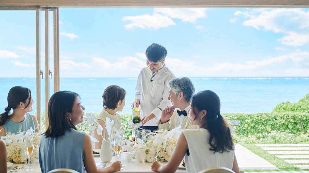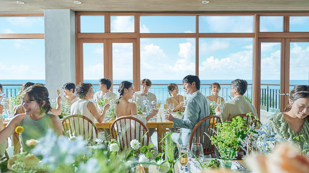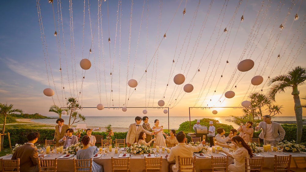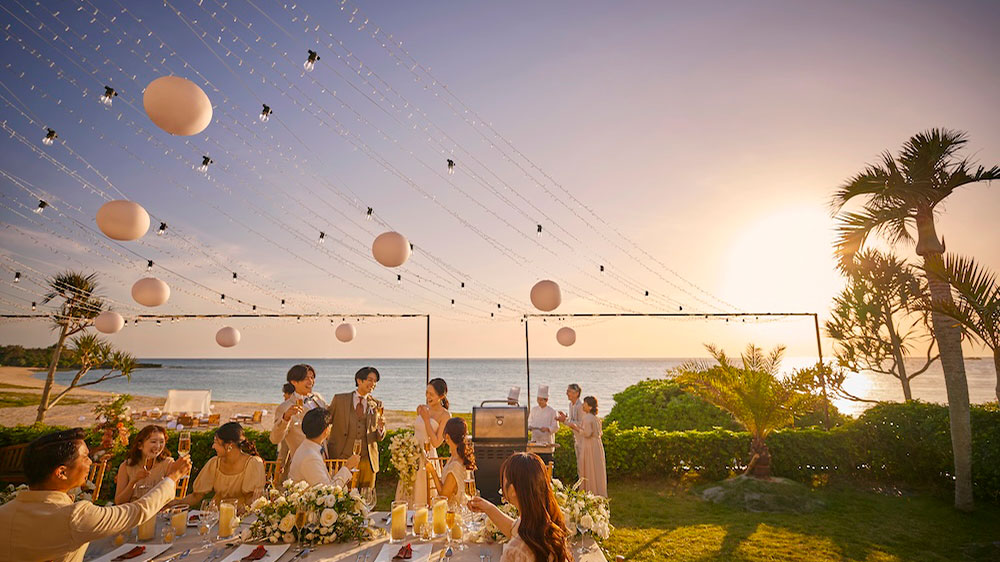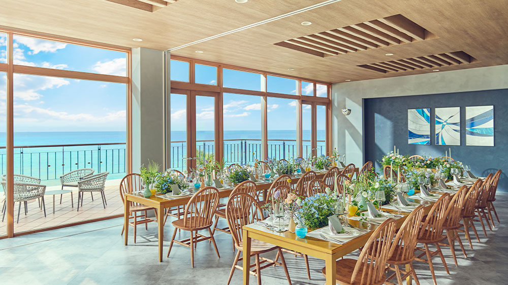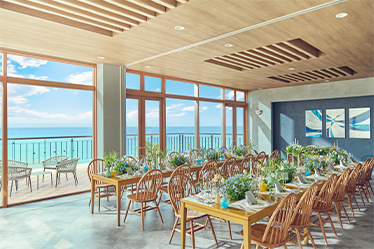 目の前に海が広がるビーチフロント。屋内とガーデンがつながる開放的な空間で、沖縄らしいリゾート感を全身で体感。夕暮れ時には、水平線に沈む夕日を望むトワイライトパーティも。贅沢で忘れられないひとときを。